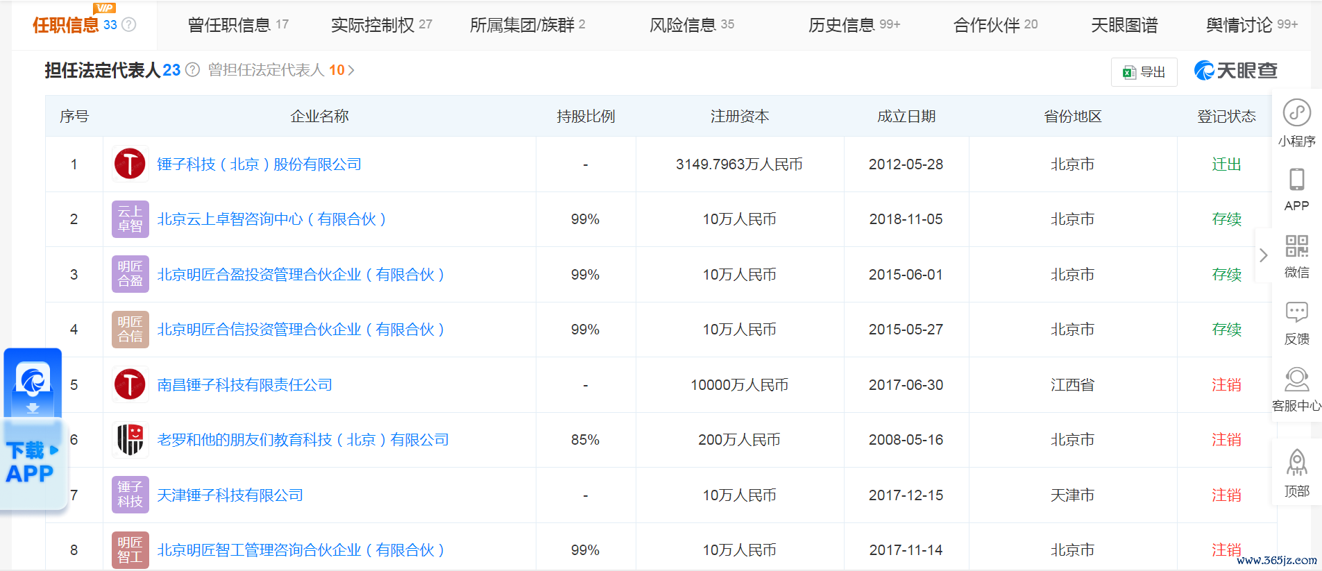 天眼查App显示,罗永浩关联30余家企业,其中10家为存续或开业状态,除在锤子科技(成都)股份有限公司、北京锤子数码科技有限公司、成都野望数码科技有限公司等锤子科技相关公司持股及任职外,其还持有广州盖得排行信息科技有限公司、北京大象蓝典科技有限公司,以及北京云上卓智咨询中心(有限合伙)等合伙企业股份。