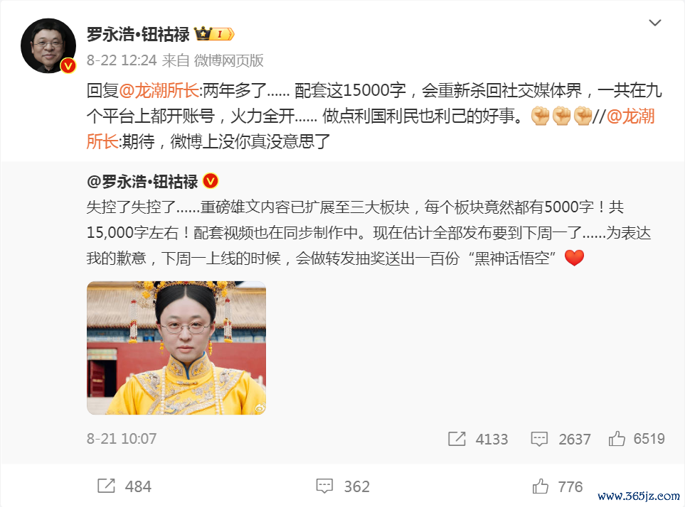 微博平台显示,此前因宣布退网后辟谣需要而注册的“罗永浩的辟谣号”已更名为“罗永浩·钮祜禄”,同时,该微博22日发布了一条内容,显示将在下周一(26日)发布一则15000字左右的重磅雄文,并配上了个人的“熹贵妃回宫照”。