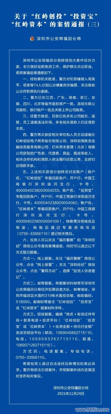 随后,2021年9月25日,深圳福田警方通报“红岭创投”“投资宝”“红岭资本”涉嫌非法集资犯罪的相关案情。