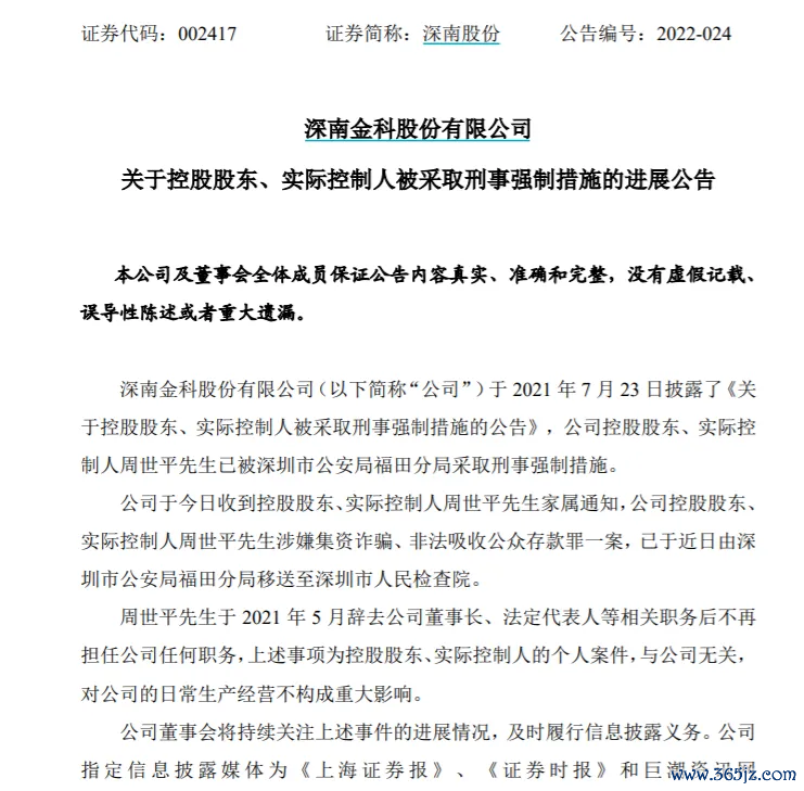 2022年4月14日晚间,上市公司深南股份也发布公告称,公司收到控股股东、实际控制人周世平先生家属通知,公司控股股东、实际控制人周世平先生涉嫌集资诈骗、非法吸收公众存款罪一案,已于近日由深圳市公安局福田分局移送至深圳市人民检查院。